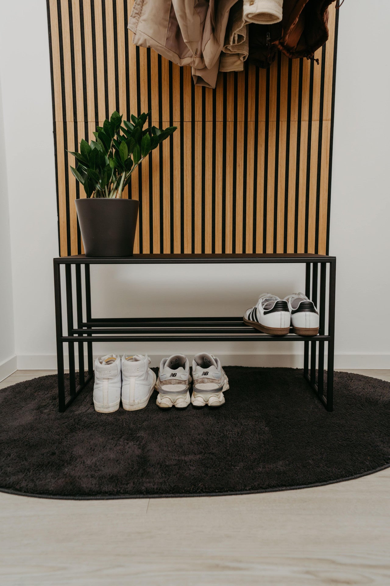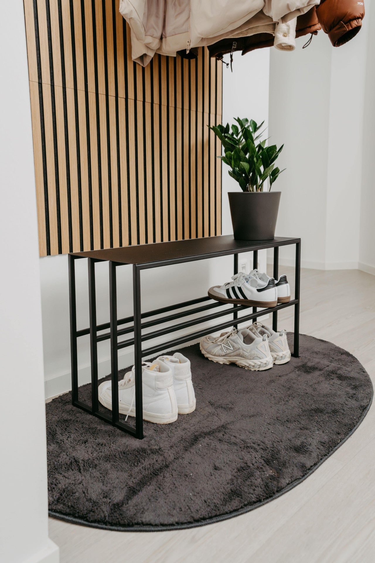 Mach deinen Eingangsbereich oder Wohnraum ordentlicher und gleichzeitig stilvoller. Dieses handgefertigte Schuhregal aus einem einzigen Stück Metall ist nicht nur ein echter Hingucker, sondern auch extrem praktisch. Durch die hochwertige Pulverbeschichtung ist es besonders robust und bekommt eine elegante, matte Oberfläche.